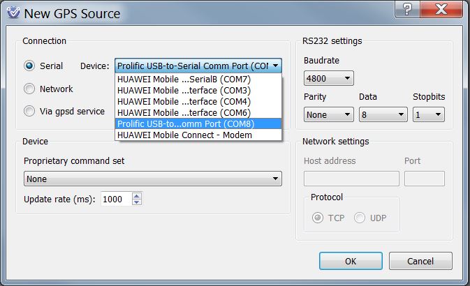 In the New GPS Source dialogue, select the GPS device from the list and configure RS232 settings here: