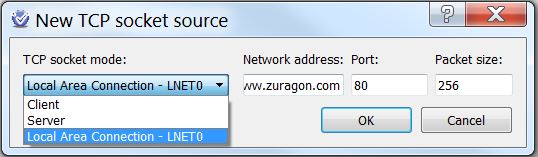 For example, below is a screenshot when adding the TCP socket, you need to select the Ethernet source from the drop-down list if you want to use the spy mode. Then configure the network address, the port number and the package size.